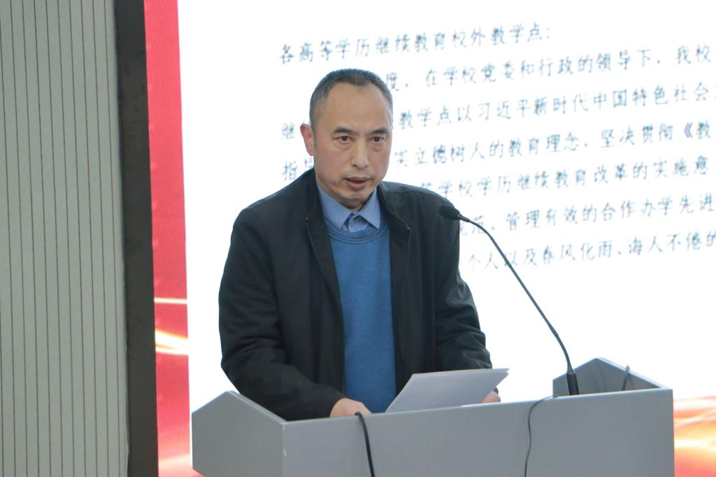 李德海代表學校向大會致辭,首先向與會的各校外教學點老師表示熱烈的歡迎,并充分肯定了我校高等學歷繼續教育取得的成績。李德海指出2023年是高等學歷繼續教育深化改革的開局之年,是全面貫徹教育部[教職成廳]1號和2號文件精神的起始之年,是統籌落實二十大報告提出的“建設全民終身學習的學習型社會、學習型大國”的奠基之年。因此,辦好高等學歷繼續教育既是上級要求,也是社會責任,更是歷史使命。李德海強調要提高政治站位、深化思想認識,全面貫徹黨的教育方針,厚植愛國主義情懷,堅持落實立德樹人的育人理念,堅守為黨育人、為國育才的初心使命,為辦好人民滿意的繼續教育做出更大的貢獻。