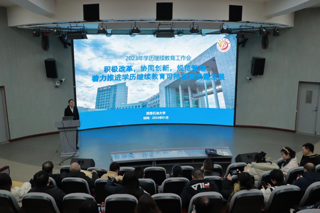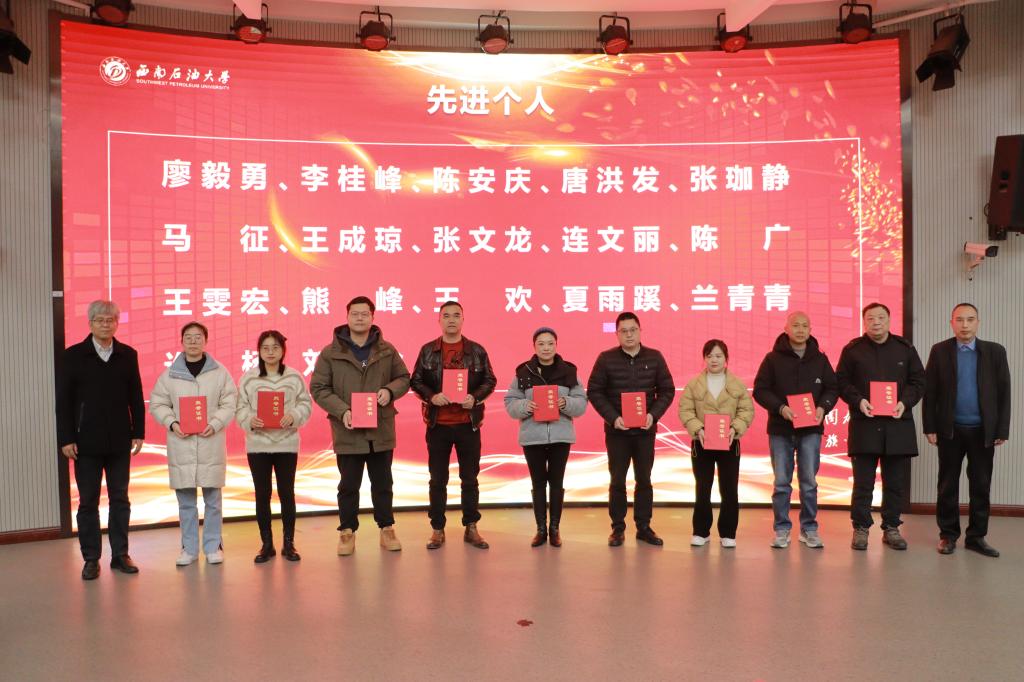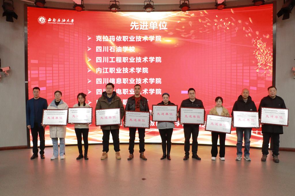 許亞平宣讀《西南石油大學關于表彰2023年度高等學歷繼續教育先進單位、先進個人及優秀教師的決定》。李德海、趙剛、許亞平、朱治富共同為獲獎的單位和個人頒獎。
