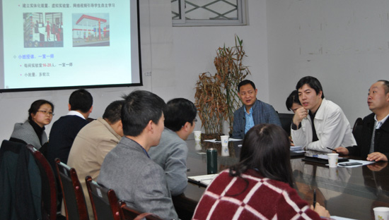 2015年3月25日上午,西華師范大學化學化工學院院長劉全忠、實驗設備處副處長田茂潔、化學化工學院副院長楊秀培、實驗室主任秦大斌等一行7人來實驗中心進行交流調研。交流會由化學化工學院院長葉仲斌主持,黨委書記陳馥、副院長段明,學校實驗室與設備管理處副處長吳雁等出席會議。交流會上,實驗中心常務副主任朱鵬飛首先代表實驗中心對中心的師資隊伍情況、實驗教學管理與儀器設備管理情況及實驗系列崗位工作量計算與考核辦法進行了介紹。之后,雙方主要就實驗中心人員管理、物資管理、實驗教學安排、實驗教學改革、競賽培訓情況等情況進行了詳細深入的交流和探討。院長助理李敏、實驗中心副主任卿大詠、中心教師王娜、張富曉等參加座談。 |