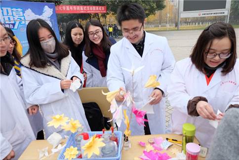 12月8日,“中心”聯合學院團委舉辦的第三屆“化學嘉年華”活動在博學樓廣場成功舉行。活動中,學生們利用各類趣味化學知識表演了“五彩酸堿花”、“神奇天氣瓶”、“大象牙膏”、“水下深林”、“噴霧作畫”、“光飛舞”等節目,充分展示了“化學人”對專業和生活的熱愛以及追求創新的精神。同時通過本次活動,一定程度上促進化學安全知識的普及,讓學生們體驗到了化學在生活中無處不在。充分展示了“化學人”對專業和生活的熱愛以及追求創新的精神,激發了大家學習化學的欲望,點燃了大家的探索科學的熱情!