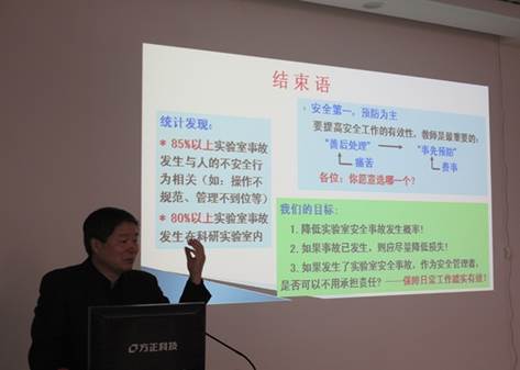 報(bào)告會(huì)上,馮建躍處長(zhǎng)通過國(guó)內(nèi)外大量案例分析了實(shí)驗(yàn)室安全事故的種類和事故發(fā)生的原因,結(jié)合自己多年對(duì)實(shí)驗(yàn)室安全管理工作的專業(yè)研究和工作實(shí)踐積累的實(shí)踐經(jīng)驗(yàn),介紹了一套完善的督查、自查高校實(shí)驗(yàn)室安全的檢查指標(biāo)體系,該體系涉及11個(gè)大類,40個(gè)小類,235個(gè)條款。此外,馮處長(zhǎng)還介紹了加強(qiáng)實(shí)驗(yàn)室安全的應(yīng)急與救援策略,報(bào)告結(jié)束后還詳細(xì)回答了現(xiàn)場(chǎng)人員的提問。