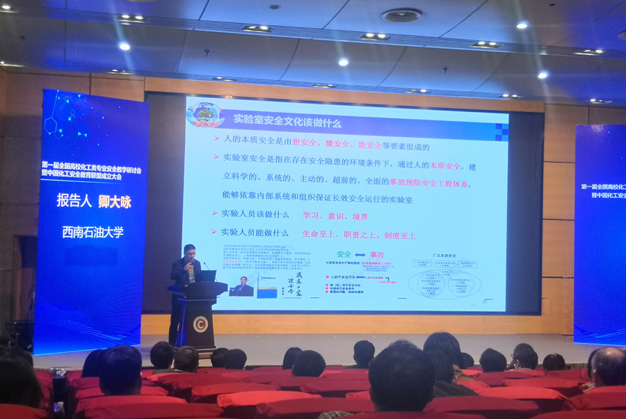 2019年11月24日,第一屆全國高校化工類專業安全教學研討會暨中國化工安全教育聯盟成立大會在常州大學順利舉行。教育部高等學校化工類專業教學指導委員會副主任委員、中北大學劉有智,教育部高等學校化工類專業教學指導委員會副主任委員、浙江大學李伯耿,國家應急管理部危化品監管司處長劉麗,江蘇省教育廳高教處處長邵進,集美大學校長李清彪,吉林化工學院校長莊志軍,沈陽化工大學校長許光文,遼寧石油化工大學副校長王海彥,中國化工教育協會秘書長唐旭華,江蘇省化工行業協會趙偉建會長,華東理工大學副校長李濤,沈陽工業大學遼陽分校校長陳延明,廣東石油化工學院黨委副書記紀紅兵,常州大學黨委書記陳群,常州大學校長蔣軍成,以及教育部高等學校化工類專業教學指導委員會委員、全國100余所高校的領導和老師、協會、企業代表共計200余人參加了會議。會議開幕式及聯盟成立儀式由常州大學副校長徐守坤主持。此次會議由教育部高等學校化工類專業教學指導委員會主辦,常州大學和中國石油大學(華東)共同承辦。實驗中心卿大詠參加了會議并在會上作題為《高校化學化工實驗室管理難點及管理實踐》的專題報告。