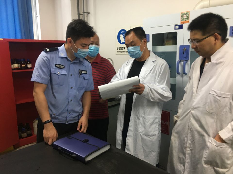 6月18日上午,新都區公安局社區民警在學校實驗室與設備管理處物質供應科相關老師的陪同下到中心進行實驗室化學試劑儲存及管理的相關檢查,實驗中心副主任卿大詠,實驗室安全員趙徊潔帶領其對教學實驗室、試劑暫存庫房進行了檢查。