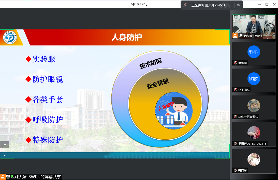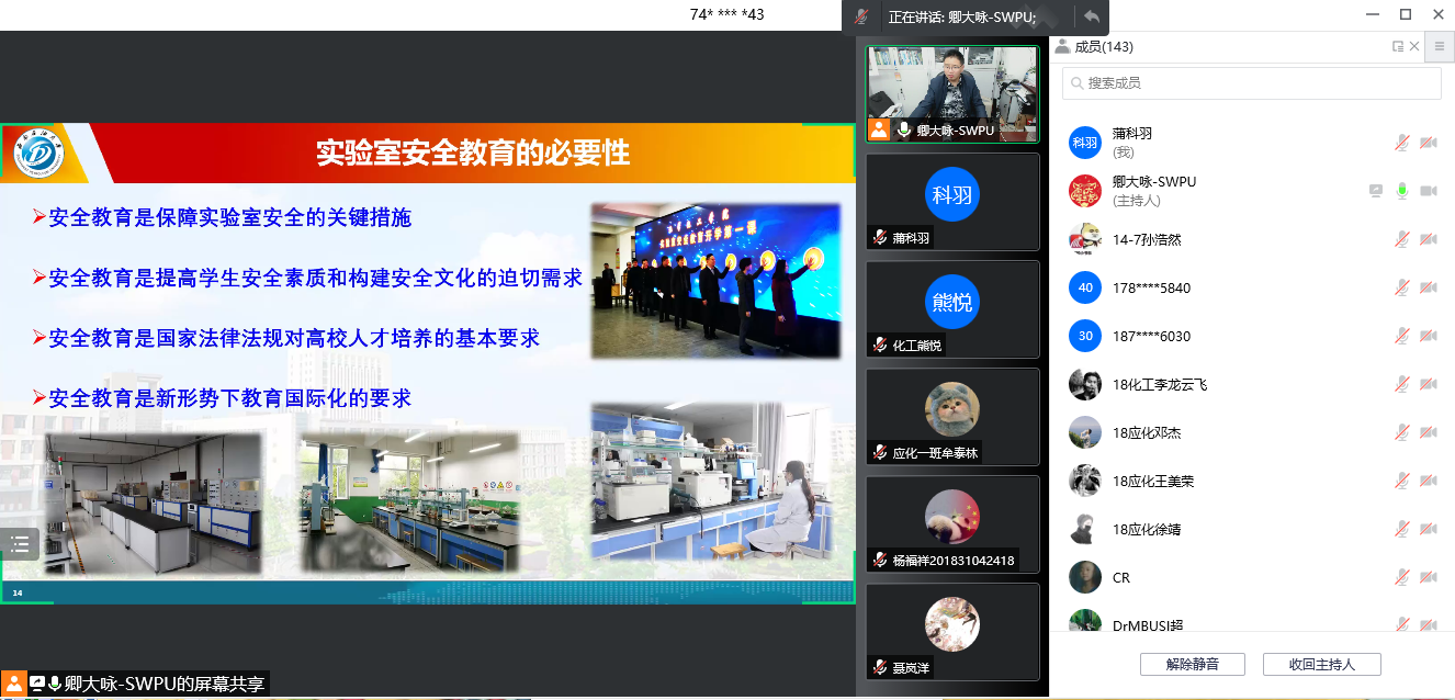 3月22日晚,化工院實驗中心在線上對本學期在實驗室完成本科畢業設計的2018級本科生進行了實驗室安全專題教育,實驗室分管安全工作副主任卿大詠、安全管理員趙徊潔和蒲科羽一同參加了此次講座。