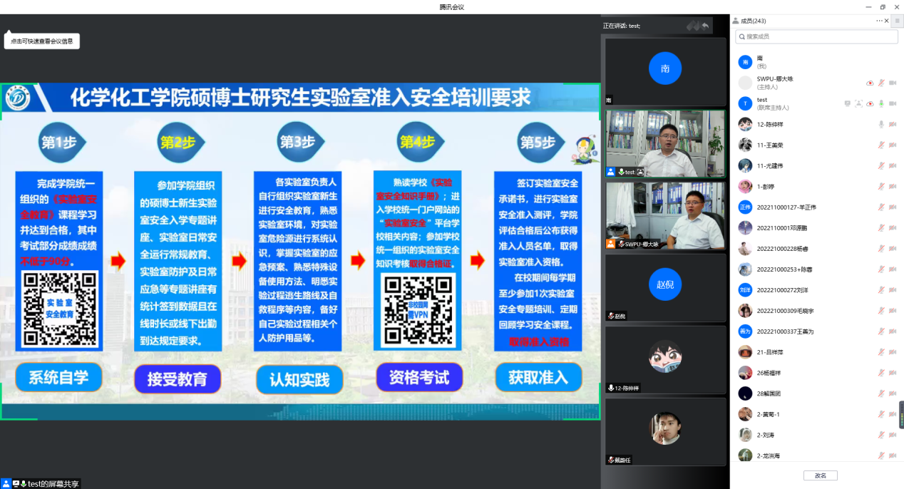 9月24日上午,化學化工學院開展了線上《實驗室安全規范——2022年秋季學期研究生開學安全專題講座》,共計240多學生參加了本次講座。實驗室分管安全工作副主任卿大詠擔任主講,做了題為“從實驗室安全到社會責任擔當”的安全教育,學院安全管理員趙徊潔和蒲科羽也參加了講座。