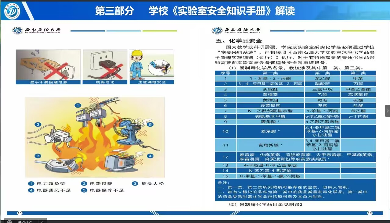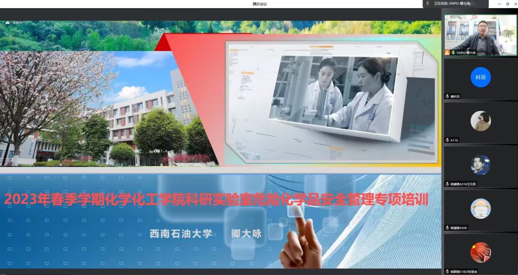 2023年3月29日下午,化工院實驗中心開展了線上“2023年春季學期化學化工學院科研實驗室危險化學品安全管理”專項培訓,實驗室分管安全工作副主任卿大詠對各科研實驗室進行危化品專項培訓,安全管理員趙徊潔和蒲科羽也參加了本次培訓。
