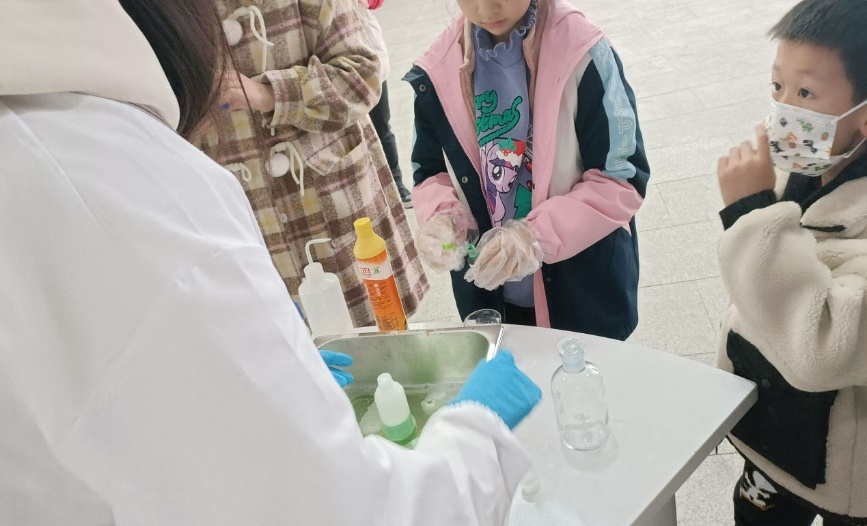 三個實驗在化學化工國家級實驗教學示范中心負責人朱鵬飛教授、實驗中心教師朱天菊老師以及學院化學協(xié)會成員的帶領下,幫助小朋友和校內學生順利進行他們一步一步指導小朋友并且對于太小的小朋友他們也會稍微幫助盡量讓他們更有參與感。