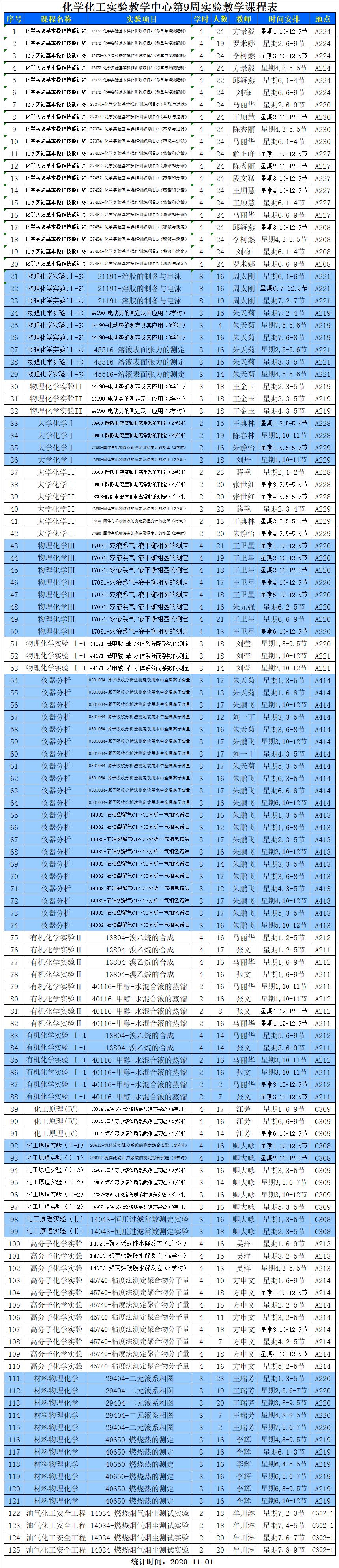 2020年秋季化學化工實驗教學中心第9周實驗教學安排