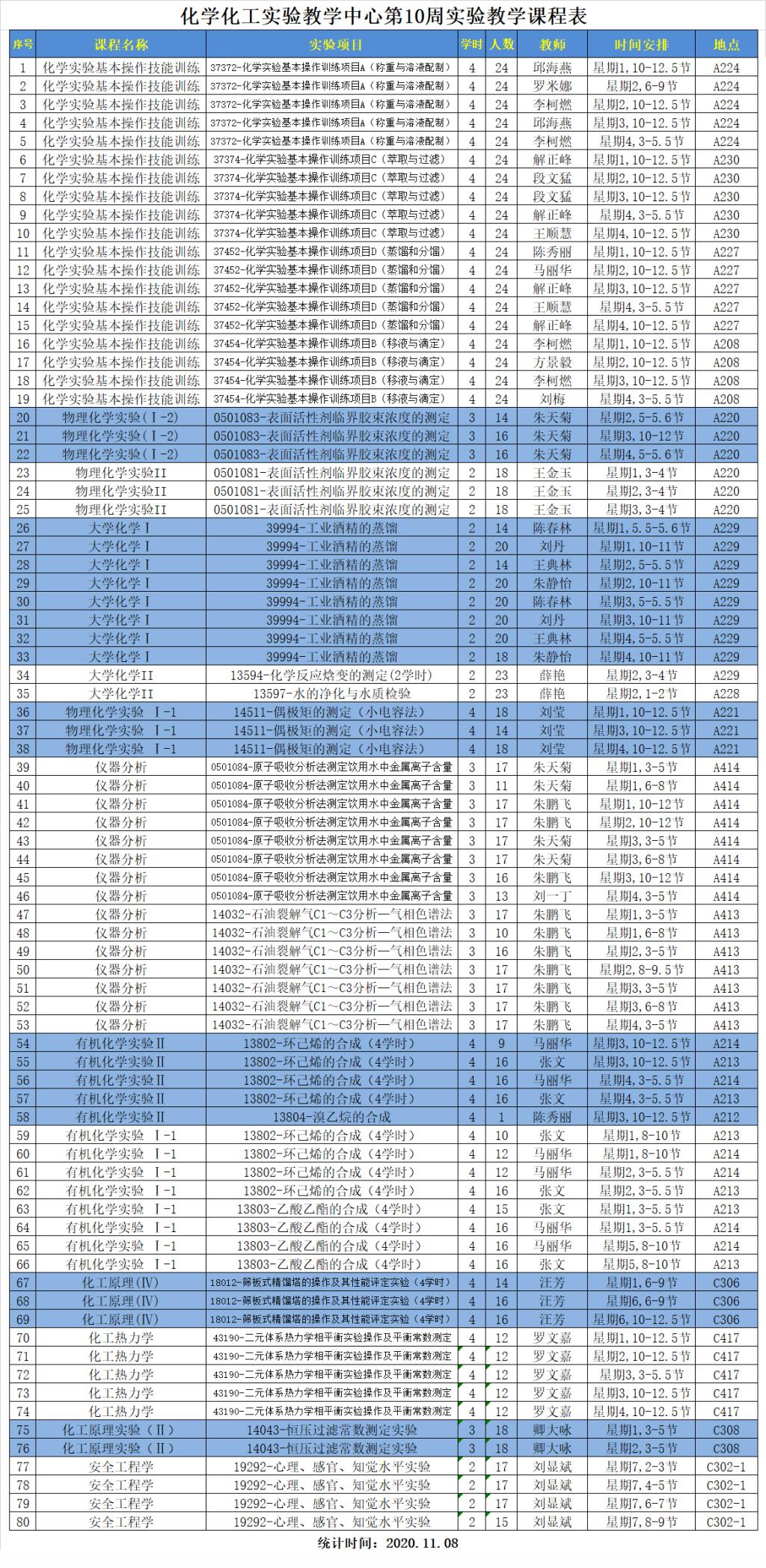 2020年秋季化學(xué)化工實(shí)驗(yàn)教學(xué)中心第10周實(shí)驗(yàn)教學(xué)安排