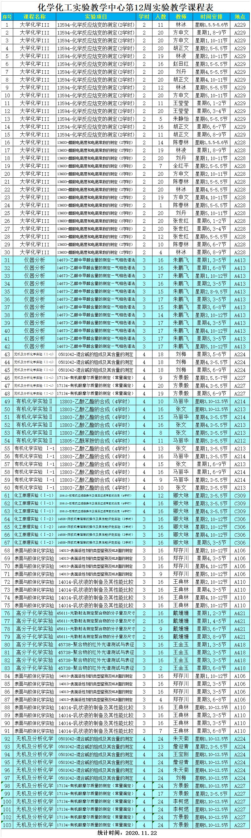 2020年秋季化學化工實驗教學中心第12周實驗教學安排