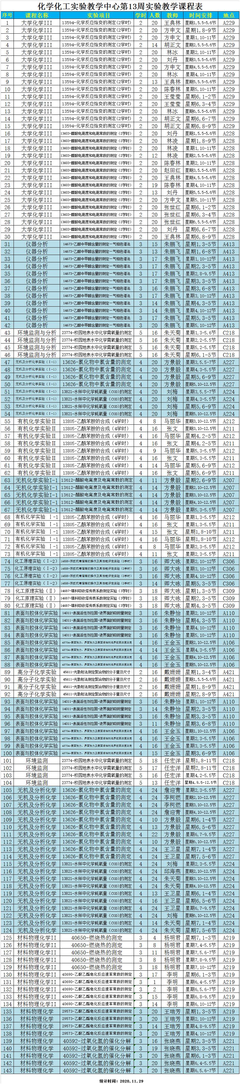 2020年秋季化學化工實驗教學中心第13周實驗教學安排