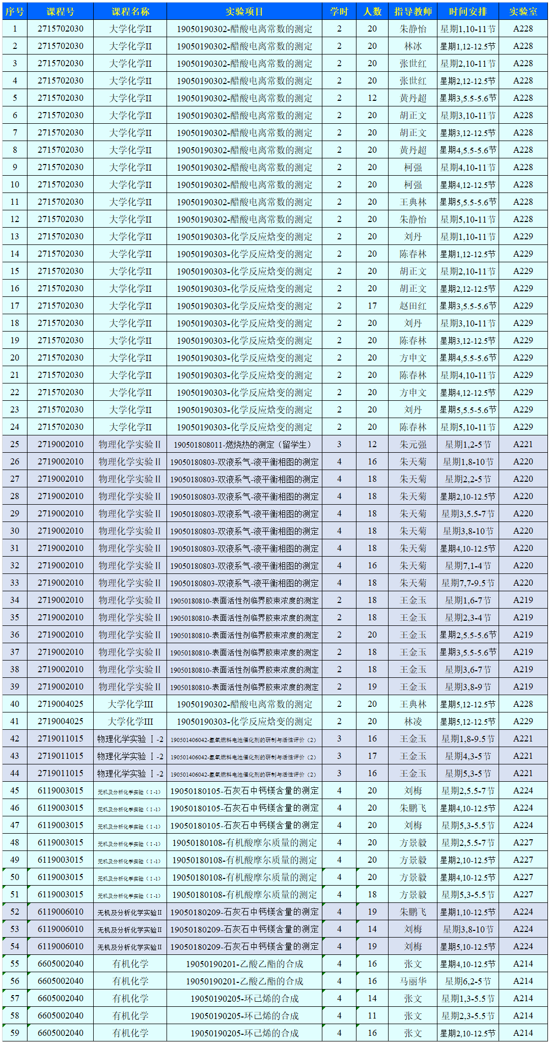 化學化工實驗教學示范中心2021年春季學期第5周實驗教學安排