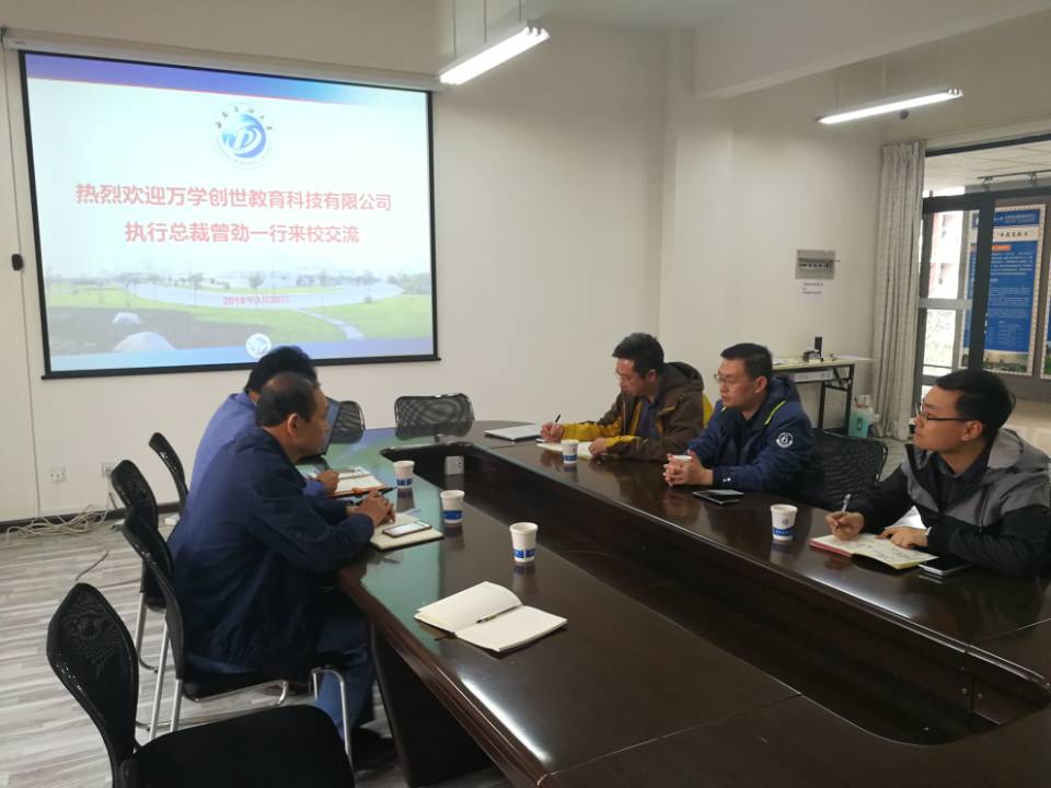 2018年3月20日,萬學創世教育科技有限公司執行總裁曾勁一行3人來我校就創新創業合作事項進行交流座談,雙創中心主任陳玉祥、副主任張磊及創新教育科主任肖鴻運參加。會議在后勤大樓209舉行。