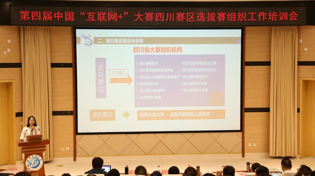 4月20日,第四屆中國“互聯(lián)網+”大學生創(chuàng)新創(chuàng)業(yè)大賽四川賽區(qū)選拔賽組織工作培訓會在我校舉行。西南石油大學黨委副書記趙正文致辭,四川省教育廳高教處副處長宋亞蘭做了大賽工作部署。