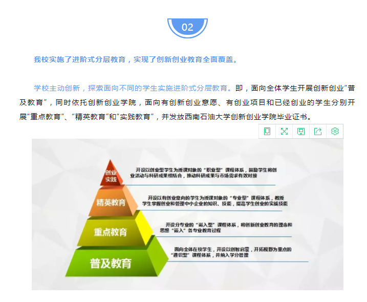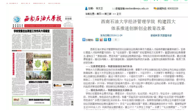 學(xué)校充分利用政行企校“四位一體”的雙創(chuàng)協(xié)同創(chuàng)新平臺,加強產(chǎn)學(xué)研用結(jié)合,通過建設(shè)“西南石油大學(xué)油氣技術(shù)轉(zhuǎn)移中心”等平臺推動成果轉(zhuǎn)化的平臺建設(shè)和政策研究,大力推進“師生同創(chuàng)”,提升了教師和學(xué)生創(chuàng)業(yè)率和創(chuàng)業(yè)成功率。