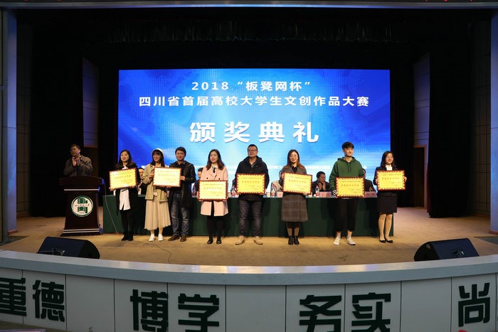 3月20日,由省國有文化資產監督管理委員會、省教育廳、省文旅廳、團省委、省工商聯共同指導的2018“板凳網杯”四川省首屆高校大學生文創作品大賽頒獎典禮在四川師范大學獅子山校區學術報告廳舉行。在本次大賽中,共青團四川省委副書記任世強、四川師范大學校黨委副書記黃鋼威、省工商聯合會副主席孫宇、省委宣傳部處長孟華、省文化和旅游廳處長王燕林、省創新創業促進會會長劉明出席本次活動并為獲獎的集體和個人頒獎。與會人員還有相關領域的專家及四川各高校師生代表200人。