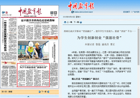 2019年8月10日《中國教育報》頭版報道我校雙創工作典型經驗