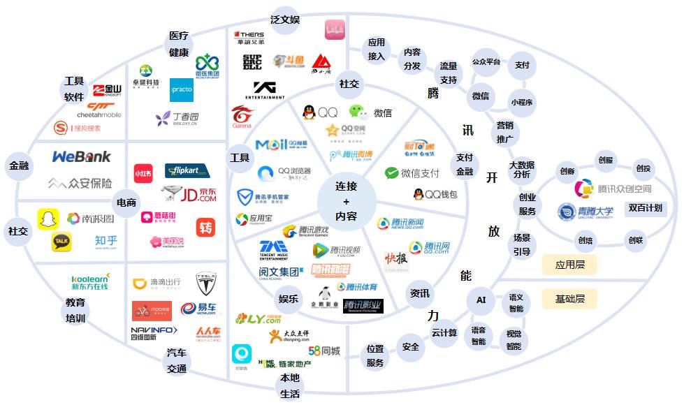 由內(nèi)而外主要分為三層,最內(nèi)層核心層、中間層為內(nèi)部生態(tài)、以及外層的外部生態(tài)以及開(kāi)放平臺(tái)。核心層聚焦于“連接+內(nèi)容”:在“連接”上讓微信、QQ等社交網(wǎng)絡(luò)作為用戶的入口,在人、設(shè)備、服務(wù)之間形成智能的連接。“內(nèi)容”上圍繞游戲、文學(xué)、動(dòng)漫、影視、體育五個(gè)方面進(jìn)行形成文娛生態(tài)。中間層的內(nèi)部生態(tài)中形成社交、娛樂(lè)、資訊、金融支付、工具五大產(chǎn)業(yè)板塊。外層可以看作是由兩個(gè)半球組成,分別由圍繞著核心競(jìng)爭(zhēng)力的生態(tài)型投資和開(kāi)放能力帶動(dòng)形成的外部生態(tài)。