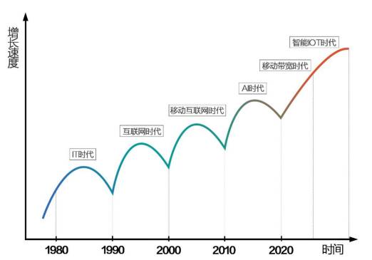 近40年以來(lái),技術(shù)社會(huì)的演進(jìn)經(jīng)歷了四大形態(tài):IT信息時(shí)代、互聯(lián)網(wǎng)時(shí)代、移動(dòng)互聯(lián)網(wǎng)時(shí)代、AI時(shí)代?,F(xiàn)在正處于一個(gè)三浪疊加的時(shí)代,即AI時(shí)代伴以移動(dòng)寬網(wǎng)技術(shù)和智能IOT共同發(fā)展。