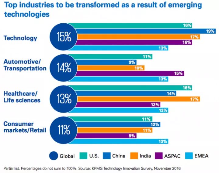 但是,總體來看,技術、無人駕駛/交通運輸業、醫療/生命科學和消費級/零售這四大行業受新興技術影響最大。在841位調查者當中,共有15%將選項投給了技術,后三項則分別占比14%、13%和11%。從這點來看,技術首當其沖,成為受新興技術推動轉型最為快速最為徹底的行業。