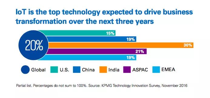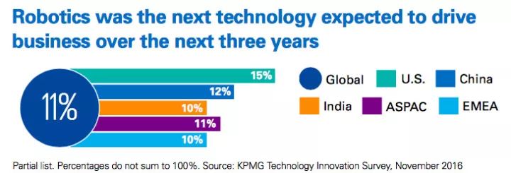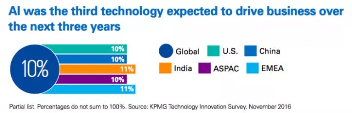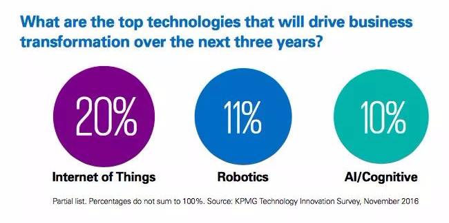 在“未來三年將推動商業轉型的最重要的技術是什么?”這一問題中,畢馬威調研了全球841位高管,共有20%的受訪者選擇了物聯網,11%選擇了機器人,而10%則選擇了AI。