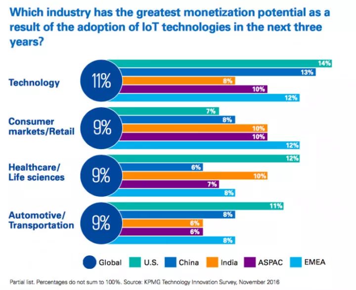 在被問及“未來三年哪些行業因采用IoT技術而擁有最大的貨幣化潛力?”時,這些科技行業的高管更看好科技領域的物聯網貨幣化潛力。