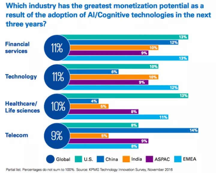 那么,未來三年有哪些行業因采用AI技術而擁有最大的貨幣化潛力?如上圖所示,在畢馬威針對這一問題的調研中,金融服務和技術兩個行業居首位,各占比11%,醫療/生命科學居其次,占比10%,而電信行業則占比9%,排第四。
