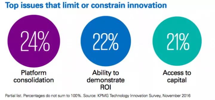 據畢馬威調查結果顯示,平臺整合、投資回報率和獲得資本是限制或阻礙創新的三大要素,占比分別為24%、22%和21%。雖然獲得資本的比率與去年大致相同,但平臺整合和投資回報率(去年為14%)均有所提升。?