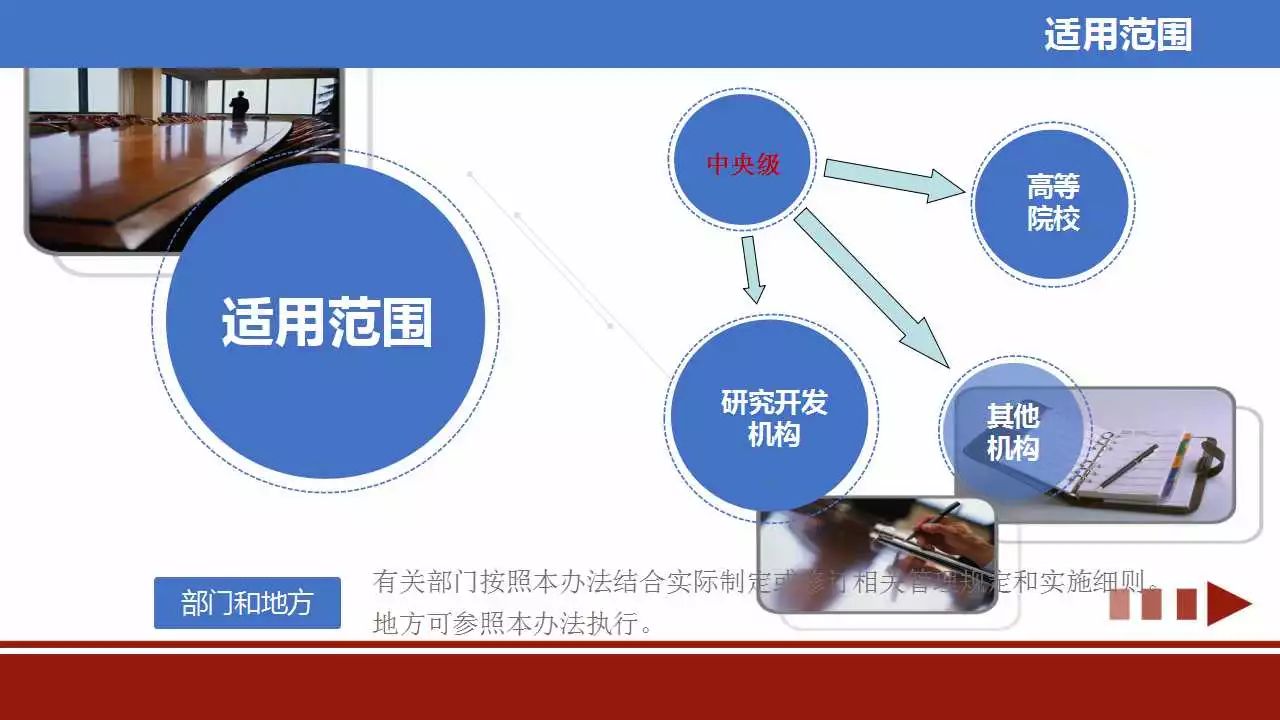 《辦法》適用于中央級的研究開發機構、高等院校以及其他機構。有關部門按照本辦法結合實際制定或修訂相關管理規定和實施細則,地方可參照本辦法執行。