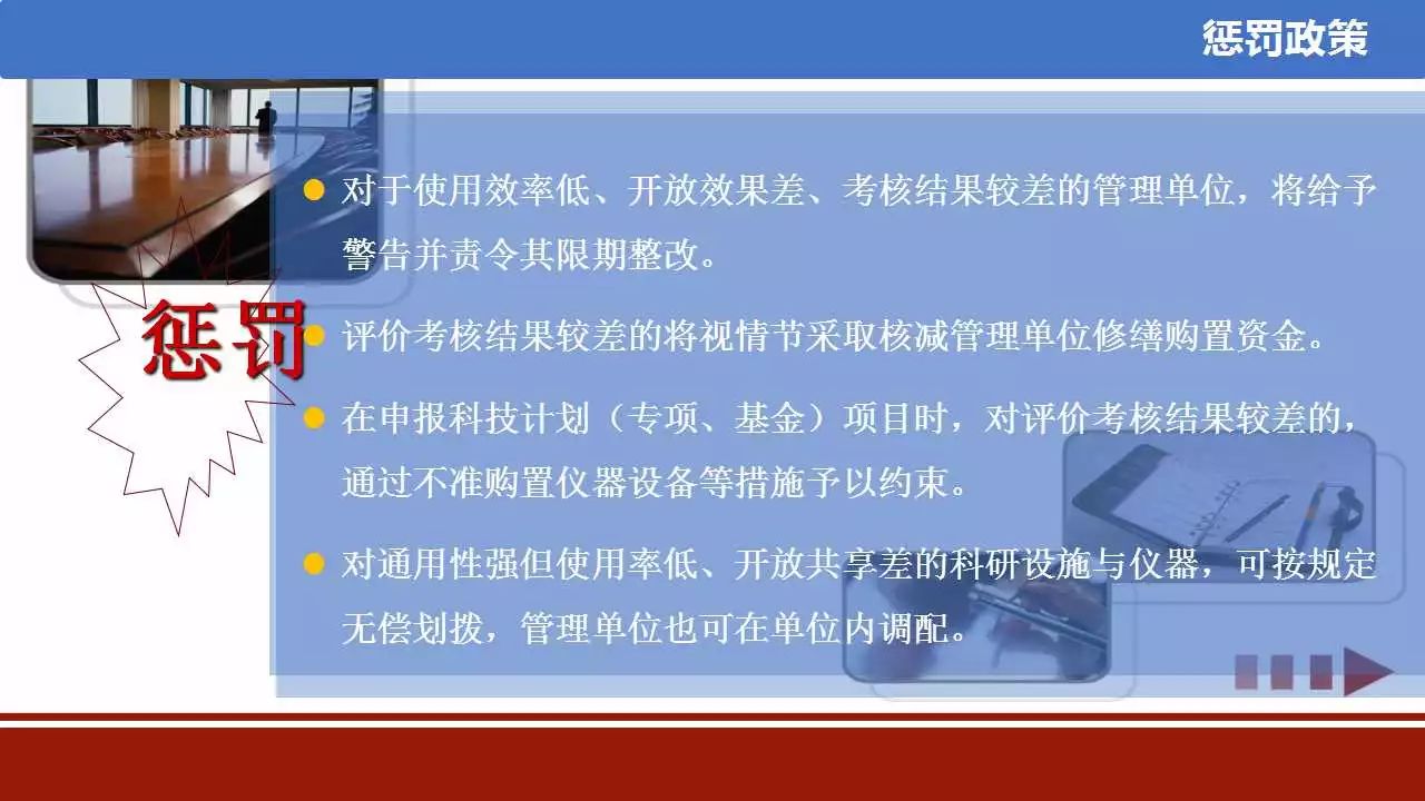 關于考核的結果。考核結果將在國家網絡管理平臺上公布,考核結果有三種應用。一是前文所述的后補助機制。二是科研設施與儀器建設和配置方面。《辦法》規定,考核結果應作為科研設施與儀器建設和配置的依據。對擬新建設施和新購置儀器的查重評議要結合考核結果。對于考核結果較差的管理單位,還要采取核減下一年度修繕購置資金、在申報科技計劃(專項、基金)項目時不準購置儀器設備等措施予以處罰。三是對相關責任主體的影響。《辦法》規定,對于考核結果較差的管理單位,科技部會同有關部門將給予警告并責令其限期整改,對不按規定履行共享使用義務的,由主管部門對相關負責人員給予處分。
