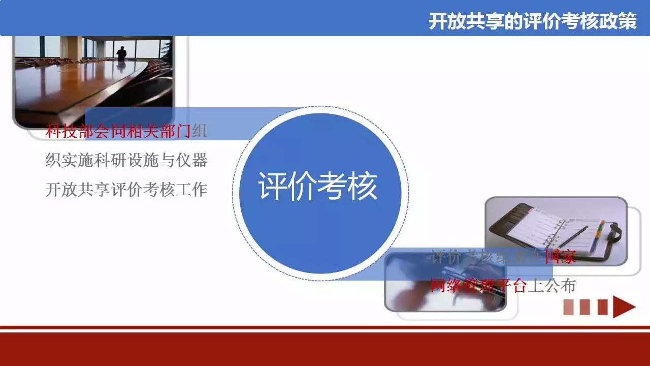 關于考核的組織。科研設施與儀器開放共享評價考核由科技部會同相關部門共同組織實施。考核采取試點先行、分步實施的方式組織開展。選擇科研儀器多、大型儀器集中、開放共享需求大的管理單位先行考核,在取得經驗的基礎上逐步推開。