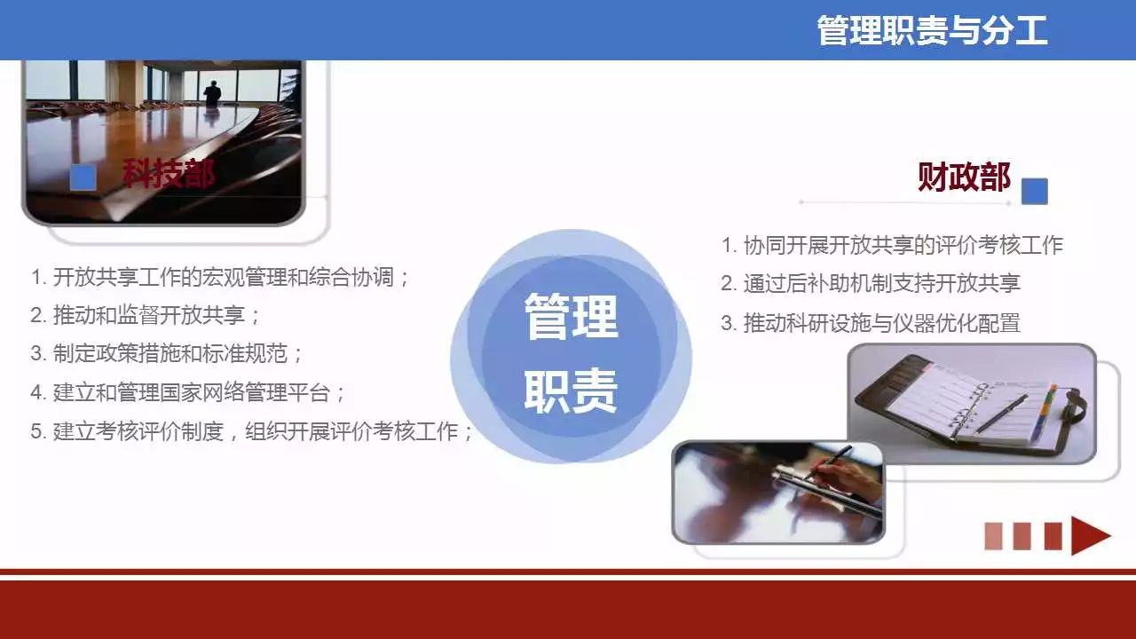 科技部牽頭負責科研設施與儀器開放共享的宏觀管理與綜合協調,推動和監督科研設施與儀器開放共享工作,會同有關部門建立和管理科研設施與儀器國家網絡管理平臺和考核評價制度,組織開展科研設施與儀器開放共享評價考核工作。