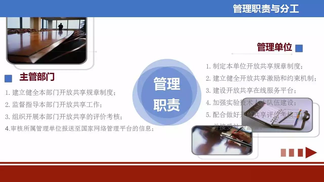 《辦法》共有五章:總則、管理職責、開放共享、考核和獎懲、附則。