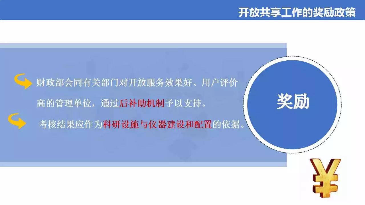 第二,通過后補助機制鼓勵開放共享。財政部會同有關部門,根據評價考核結果和財政預算管理的要求,對開放服務效果好、用戶評價高的管理單位,安排后補助經費予以支持。