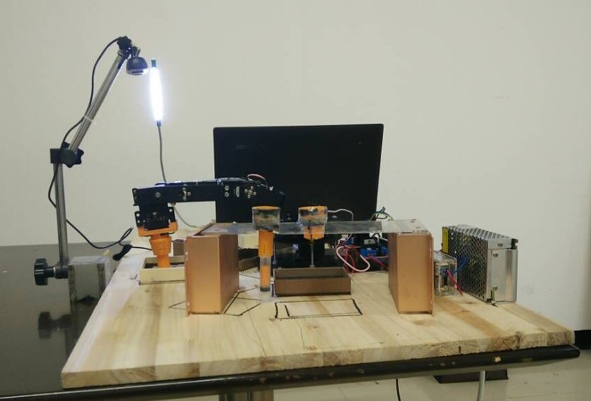 在項目展示過程中,何昌鑫同學連好設備,分揀機器能夠順利識別事先準備好的卡片,引來了參會專家和同學的觀賞。同時,他也讓在場同學們拿出自己的紙幣放在指定位置,親身體驗,感受該機器人的分揀魅力。展示過程中,呂志忠老師指出,本作品主要由視覺識別系統和多分揀頭自動更換系統組成。視覺識別系統的核心技術是基于SIFT特征提取技術的視覺模式識別,智能識別不同的物體及物體的位置、尺寸等信息。多分揀頭自動更換系統是為多自由度機器人在完成不同物體的分揀任務時,根據物體的種類、形狀等信息自動更換分揀頭,從而實現對不同物體的分揀,主要應用于人工操作的現場,智能地對多種物體進行快速分揀,以減少人力成本。