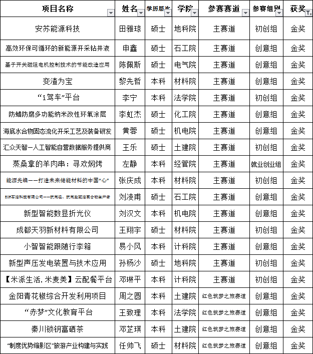 西南石油大學第四屆“互聯網+”大學生創新創業大賽金獎獲獎名單