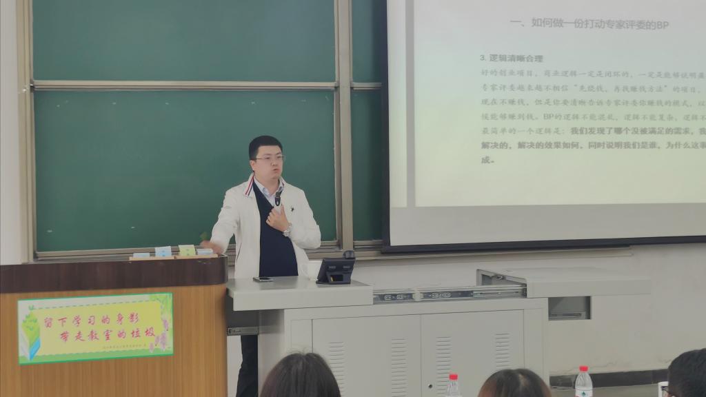 隨后大賽評審專家委員會委員潘希鴻做了題為“互聯(lián)網(wǎng)+大賽輔導(dǎo)及獲獎案例分析”的主題講座。講座中,潘希鴻老師結(jié)合自救的評委經(jīng)歷,并以真實(shí)的數(shù)據(jù)和案例支撐,總結(jié)了大賽項(xiàng)目答辯“6+1”的模式。講座最后,針對同學(xué)們的實(shí)際問題,潘老師進(jìn)行了互動答疑。
