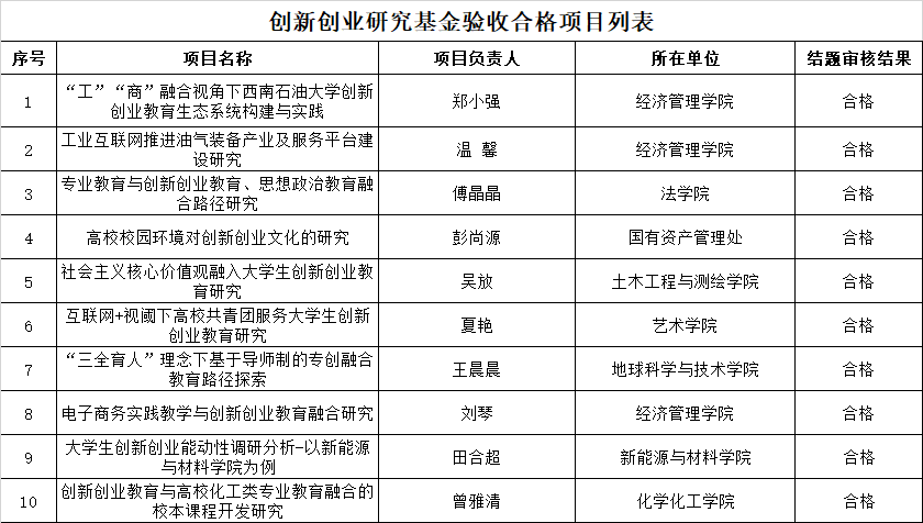 根據學校科研項目管理辦法的要求,學校組織了對2019年、2020年創新創業研究基金的結題驗收工作。經專家組審核,《“工”“商”融合視角下西南石油大學創新創業教育生態系統構建與實踐》等10項項目達到結題要求。大學生創新創業中心將撥付結題經費,經費使用范圍和報銷手續按學校相關規定執行。具體結題項目情況請見《創新創業研究基金驗收合格項目列表》。