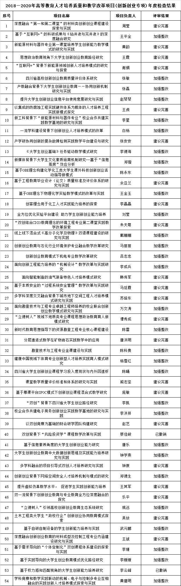 根據四川省教育廳要求,學校近期組織開展了2018—2020年高等教育人才培養質量和教學改革項目(創新創業專項)的年度檢查工作。現將檢查結果公布如下: