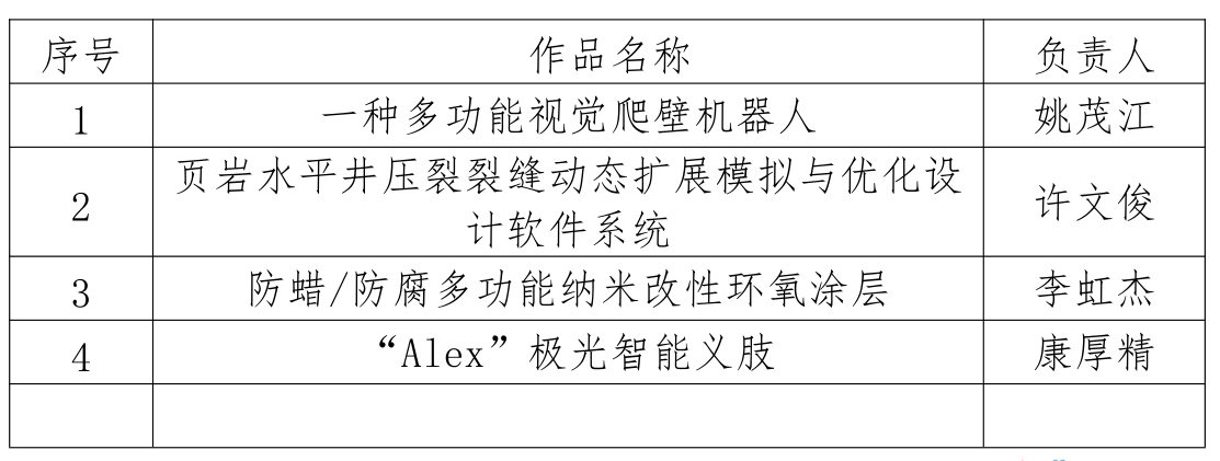 西南石油大學共有 4 件作品入圍首屆高校創新創業創造教育精品成果展決賽,現將作品名單公布如下:
