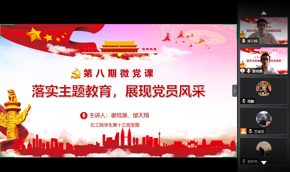 編者按:為持續推進“不忘初心、牢記使命”主題教育縱深化發展,結合抗疫實踐深化大學生愛國情、強國志和報國行。石工院學生第十三黨支部利用“互聯網+”黨建培育新模式,啟動了“教是更好的學 預備黨員講黨課”系列線上翻轉微黨課活動,每周四下午讓每一名預備期的黨員同志講一次黨課,創新了黨員教育培養方式。