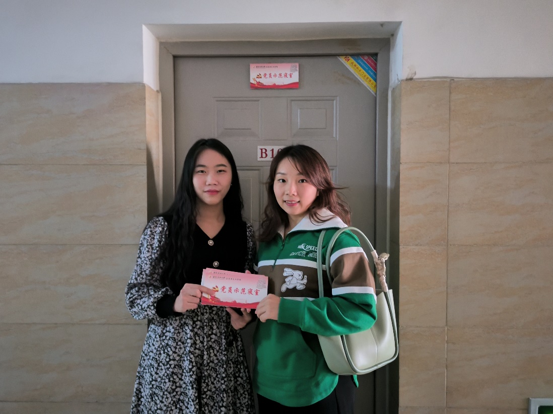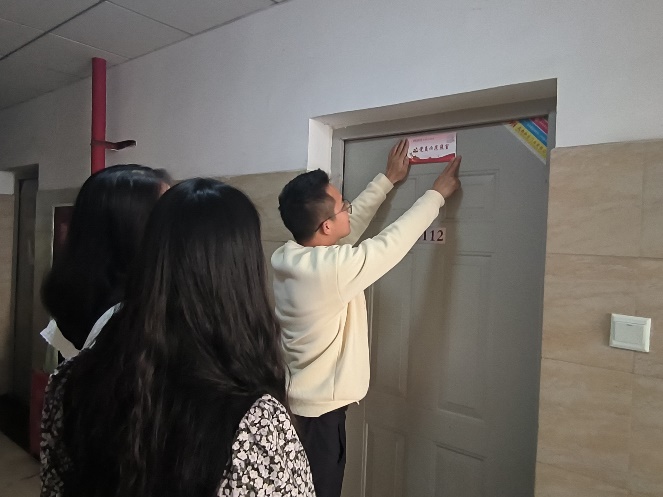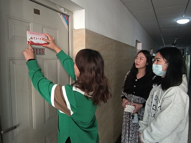 隨后張含梅書記和羅朝民老師前往學生宿舍B區1層,與學生黨員一起懸掛黨員示范寢室牌。