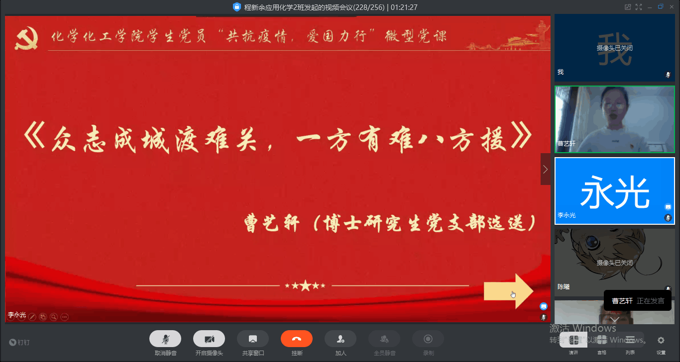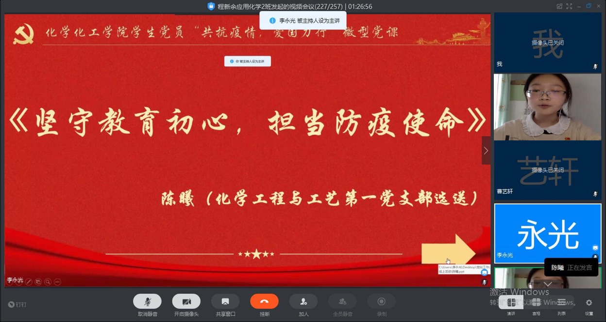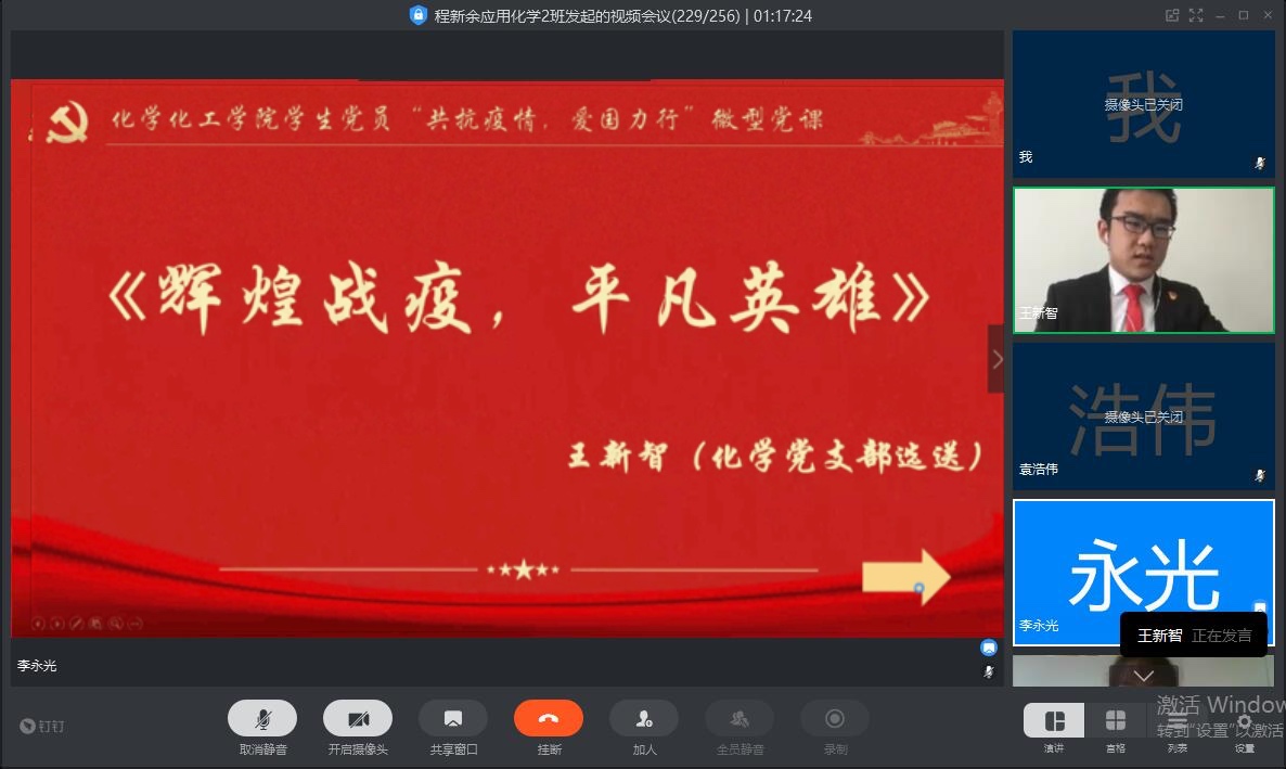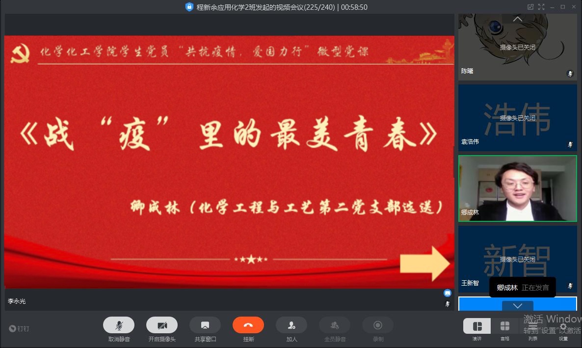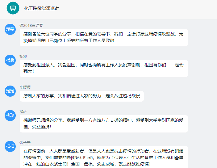 為深入學習貫徹習近平總書記重要指示精神,堅決貫徹黨中央關于新冠肺炎疫情防控各項決策部署,展現出新時期大學生黨員擔當作為、共克時艱的良好風貌,深入推進愛國主義教育,進一步激發學生黨員的責任擔當,凝聚打贏疫情防控的磅礴力量。化工院于4月2日14:30,利用釘釘直播軟件,開展了學生黨員“共抗疫情·愛國力行”微黨課公開巡講,透過正發生在中國的火熱事件,將疫情防控工作涌現的案例轉化為鮮活課堂。化工院全體黨支部書記、學生黨員均參與到本次活動中。