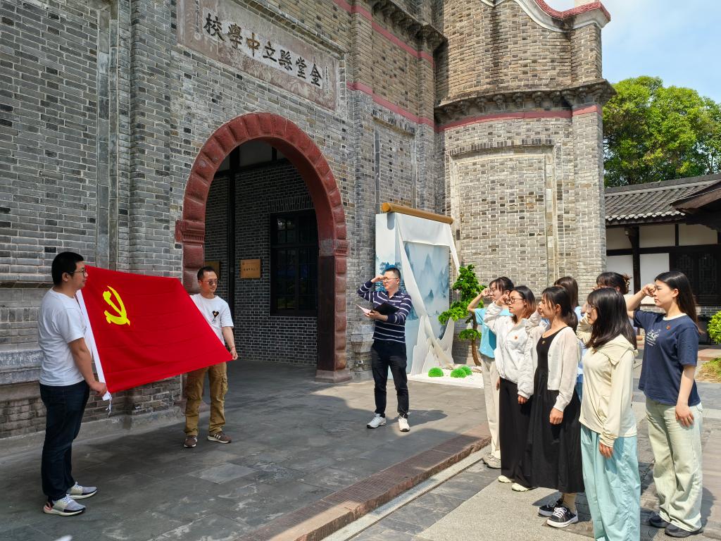 教育基地包含“紅色星火、統戰史話、走向共和、城廂印記”四個主題版塊。黨員同志們在講解員的帶領下,懷著敬畏之心,走進彭家珍大將軍專祠紀念館,聆聽彭家珍先烈年少有為、壯烈殉國的故事。講解員告訴大家,在辛亥革命緊急關頭,為配合孫中山六路北伐,彭家珍炸死清王朝宗室首領良弼,自己當場壯烈殉國,時年僅23歲。他為爭取革命勝利而慷慨獻身的大無畏精神和英勇氣概,激勵了一代又一代人為革命、建設和改革不懈奮斗。隨后,全體黨員在黨旗下重溫了入黨誓詞,鏗鏘有力的宣誓聲震撼人心。大家還參觀了鄧公樓、抗日陣亡將士紀念碑、金堂縣立中學校舊址、繡川書院等點位,仁人志士的愛國情懷以及保家衛國的犧牲精神令人倍受鼓舞。