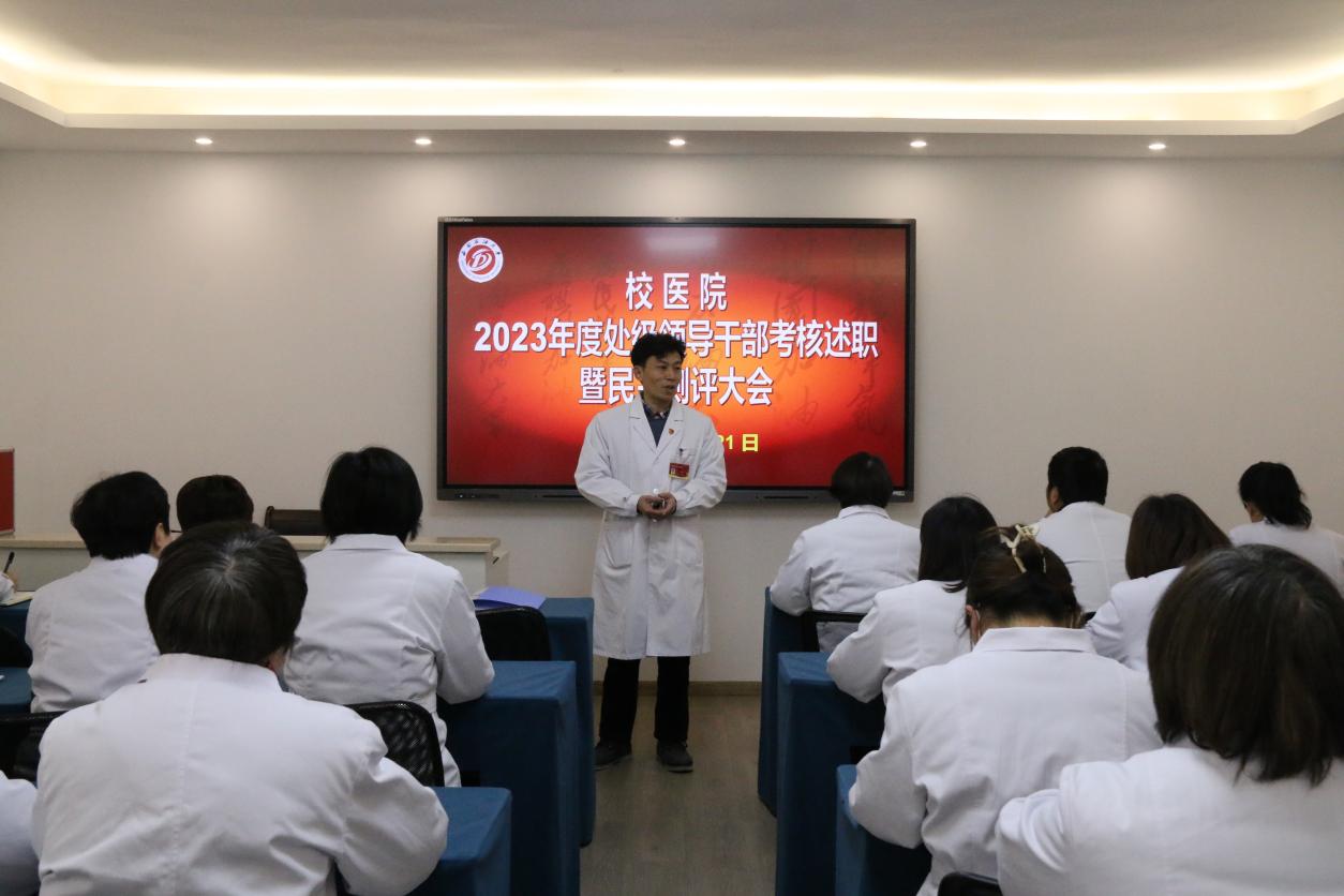 12月21日,校醫院在三樓會議室召開了2023年度處級領導干部考核述職暨民主測評大會,校醫院全體教職工參加了會議,黨總支書記胡俊、院長張繼紅分別進行了述職述廉報告。