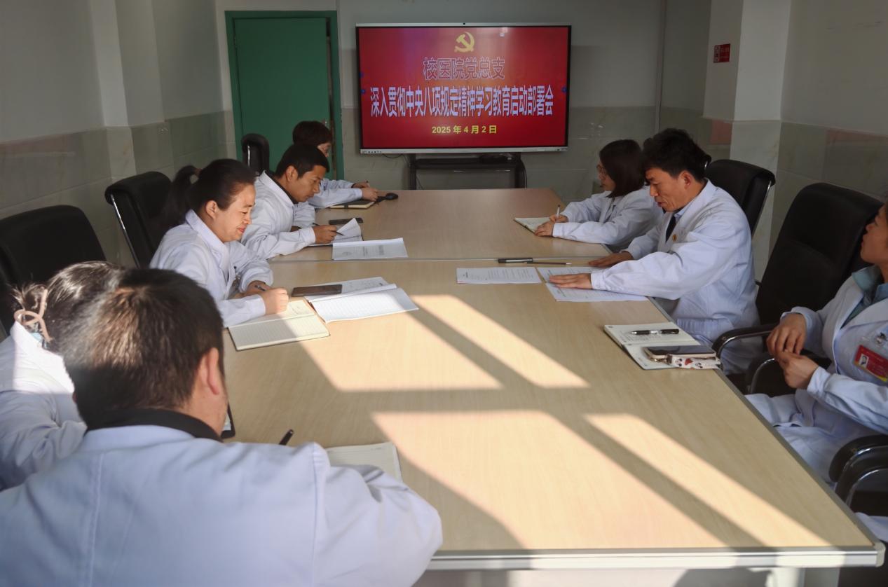 2025年4月2日,校醫院黨總支在508會議室召開深入貫徹中央八項規定精神學習教育啟動部署會。校醫院班子成員、黨總支委員、支部書記和科室主任參加了會議,會議由黨總支書記胡俊主持。