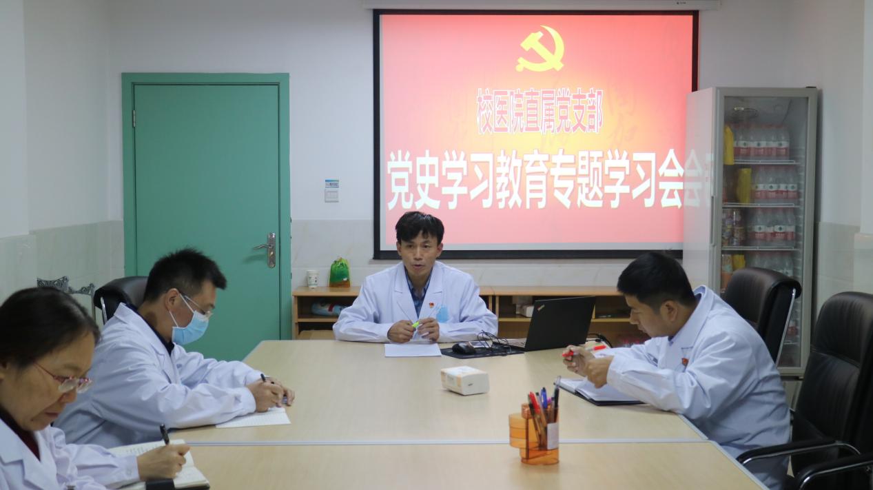 10月22日17:00,校醫院直屬黨支部在五樓會議室召開黨史學習教育專題會,胡俊同志帶領全體黨員認真學習領悟了習近平總書記在陜西榆林考察期間重要講話。