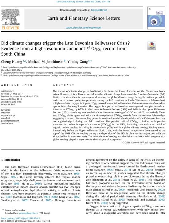 近日,我院青年教師黃程博士關于華南晚泥盆世弗拉斯期-法門期之交古氣候研究成果發表于地球科學頂級期刊《Earth and Planetary Science Letters》上。