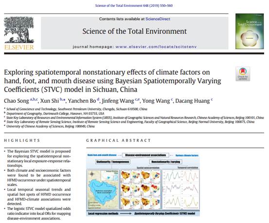 近日,我院地理信息科學專業青年教師宋超博士在國際頂級期刊《Science of the Total Environment》發表SCI論文,提出了一類新的時空局域回歸統計模型(Bayesian Spatiotemporally Varying Coefficients (STVC) model),擴展了空間統計學理論和方法體系,并用于挖掘中國四川省手足口傳染病的時空非平穩風險分異規律,對宏觀地理空間尺度傳染病防控防治具有重要應用價值。