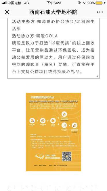 2018年11月29日由知源愛心協會和地科院生活部主辦,“噢啦OOLA”app協辦了“衣”份溫暖活動。“以廢代捐”,讓閑置的衣物通過環保回收,再由“噢啦OOLA”app捐獻給山區的孩子們,給山區的孩子們一個溫暖的冬天。
